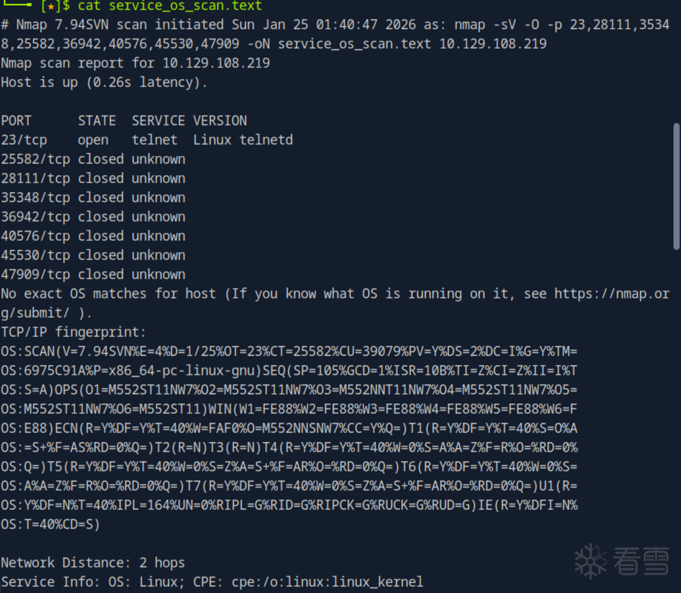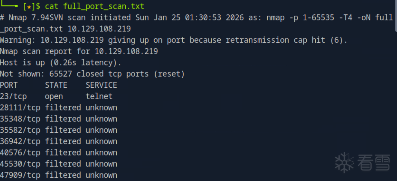 What service do we identify on port 23/tcp during our scans? 我们扫描期间识别到的23/tcp端口服务是什么?