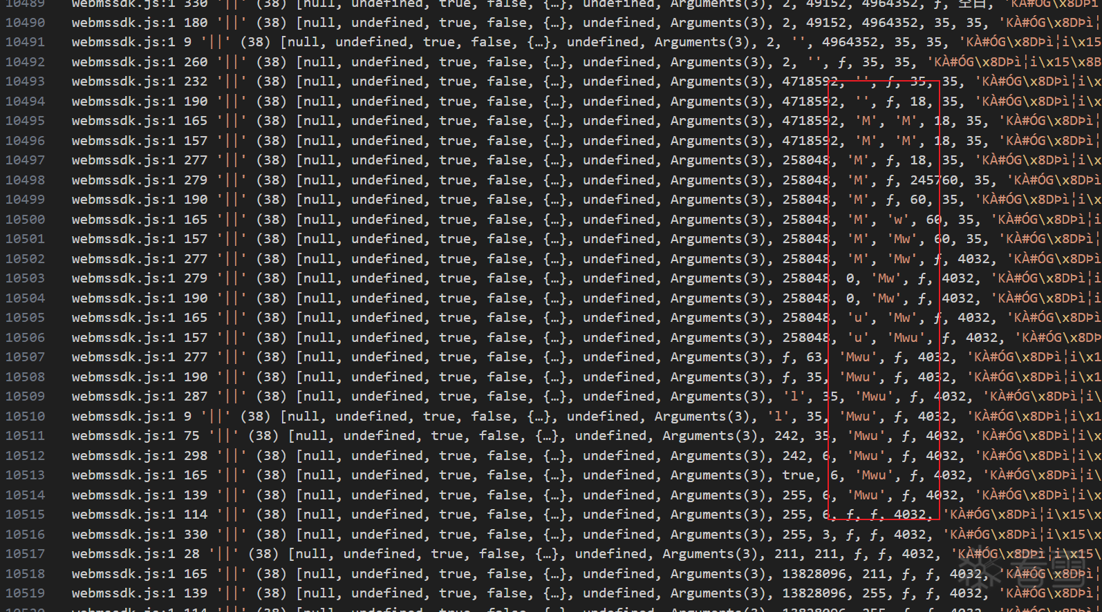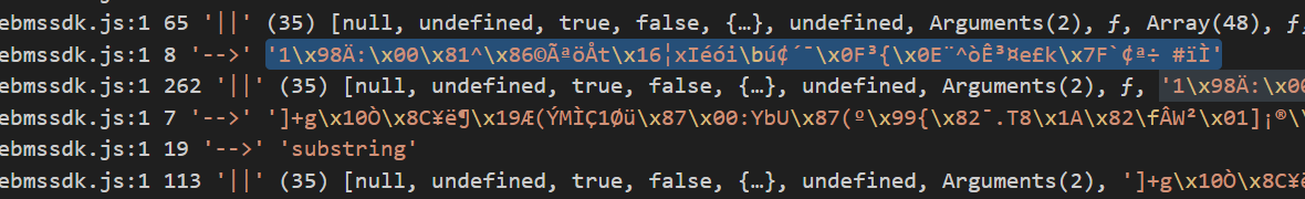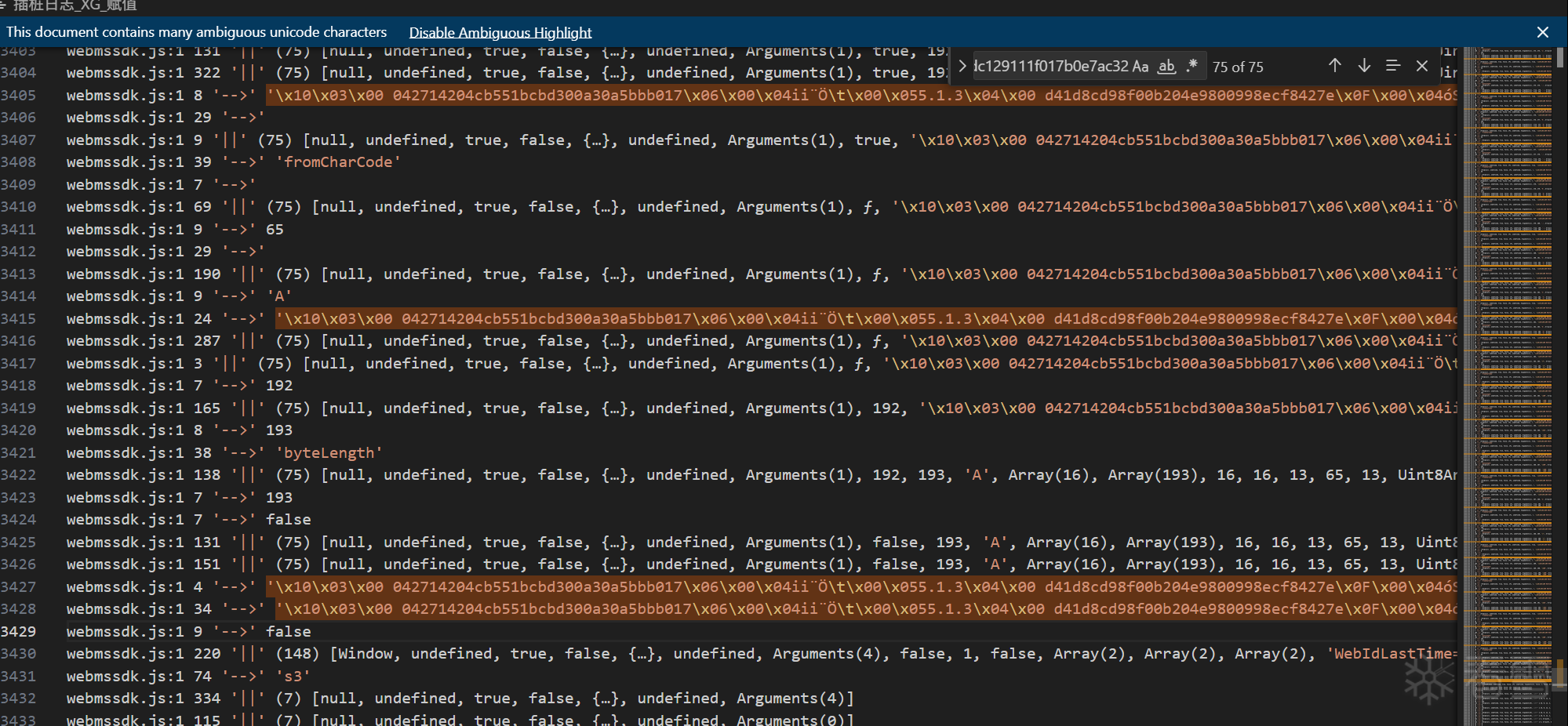 日志里面全局搜索乱码1,是突然出现的,但是再往上翻,发现同样有另外一段乱码再逐渐生成 ,最后生成的结果也是193位,另外次乱码中还有明显的md5加密的结果,可能和请求参数有关。由此猜测,乱码1和此193位乱码有关(以下简称乱码3)。