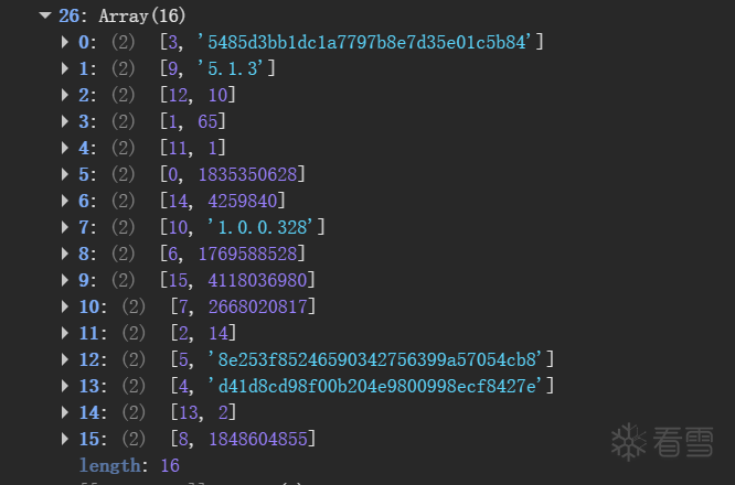 往上跟值可以发现,第4位是url的md5加密,第5位是空字符串的加密,第6位是UA的加密,第7位是时间戳,第9位根据计算时间戳和随机数计算得到,第10问是版本号,第11位是算法版本号,第15位是由时间戳计算得到。最后一位有前15位计算得到,最后,第1位,又由16位数组生成。