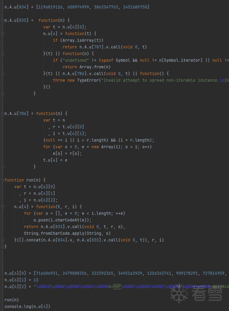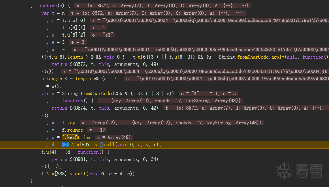 将此段代码扣出,并且将关联的n.A.u[834], n.A.u[835]扣出,整理发现是个chacha加密。