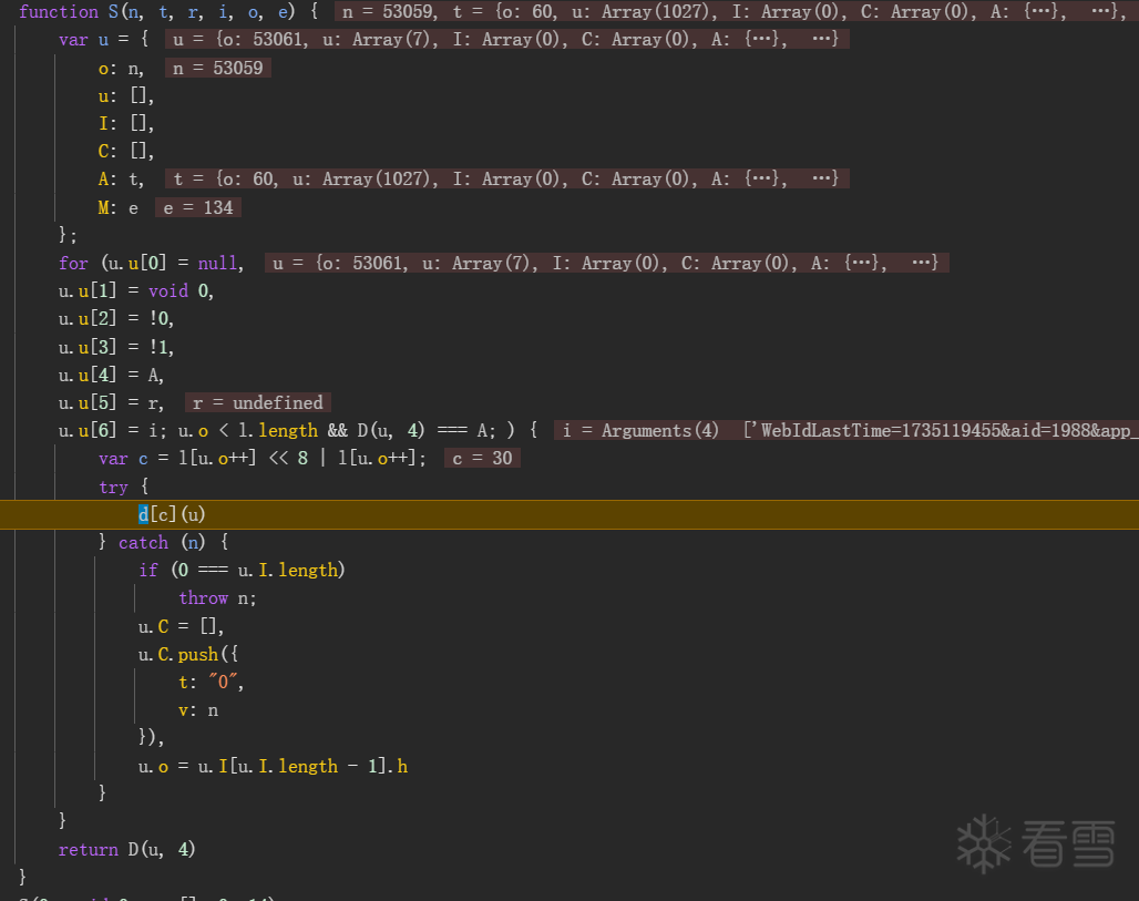 在vmp执行指令的位置,d[c](u),打上日志断点,找到x-g参数生成的地方