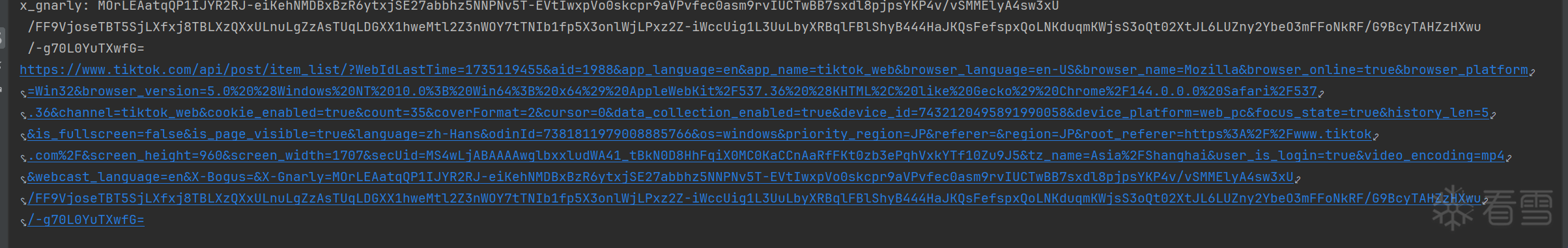 逆向接口:aHR0cHM6Ly93d3cudGlrdG9rLmNvbS9hcGkvc2VhcmNoL2l0ZW0vZnVsbC8=