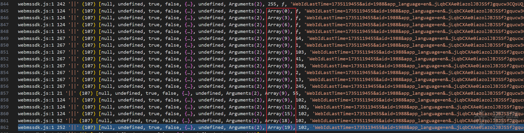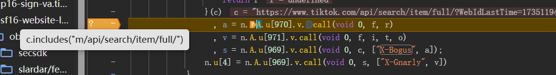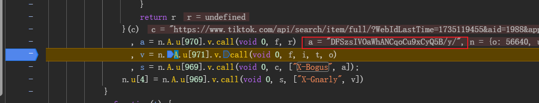 开始全局搜索,很容易在webmssdk.js位置找到。在生成位置打上断点,a就是我们要的x-bogus生成结果