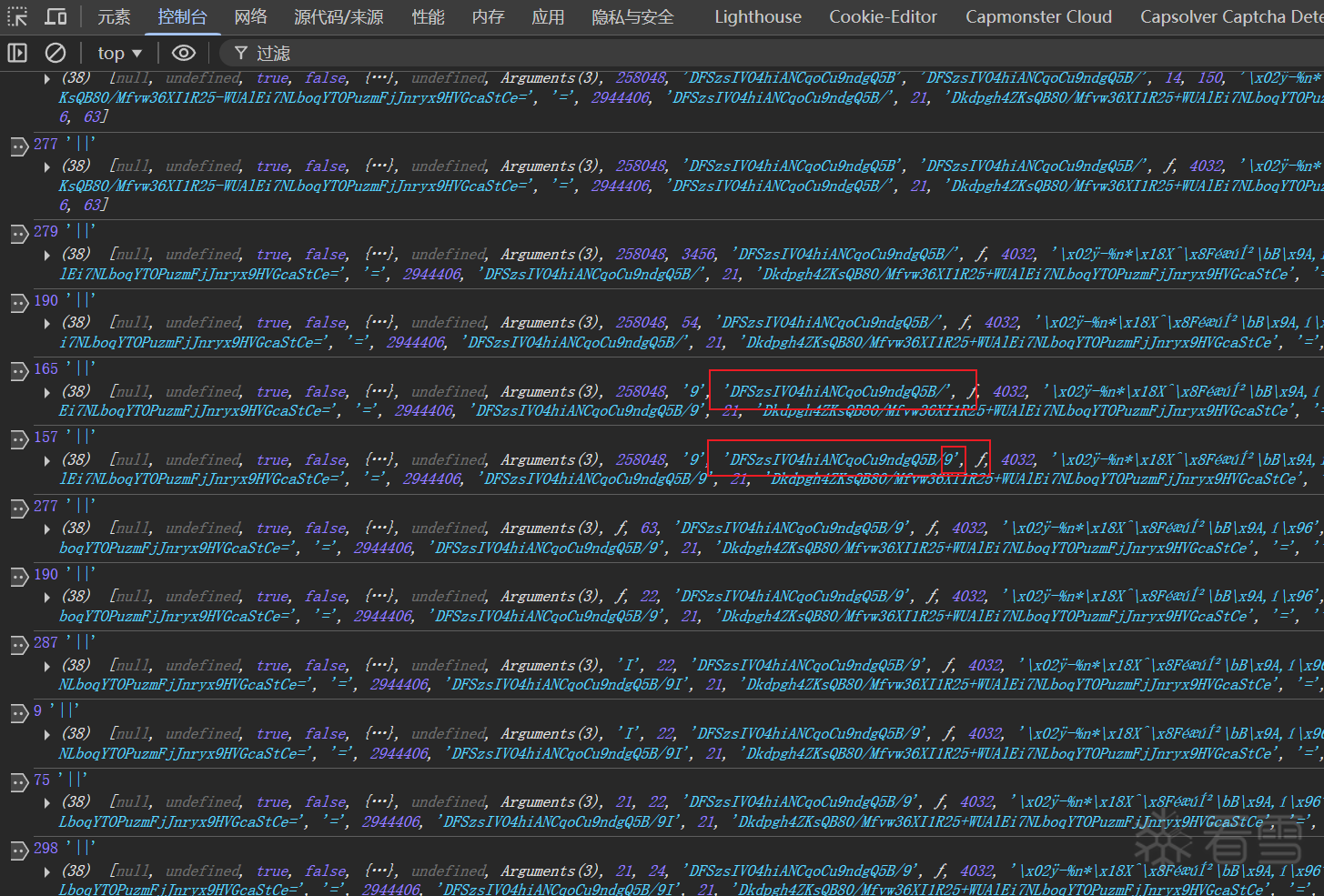开始跟值,发现x-b是由字符串'Dkdpgh4ZKsQB80/Mfvw36XI1R25-WUAlEi7NLboqYTOPuzmFjJnryx9HVGcaStCe=' 和一个乱码'\x02ÿ-%n*\x18X^\x8FéæúͲ\bB\x9A,í\x96', 经过变体hash加密生成的。经过观察,发现以上字符串是固定的,但是乱码是变动的。符合常理,乱码的生成一定和url的参数有关。