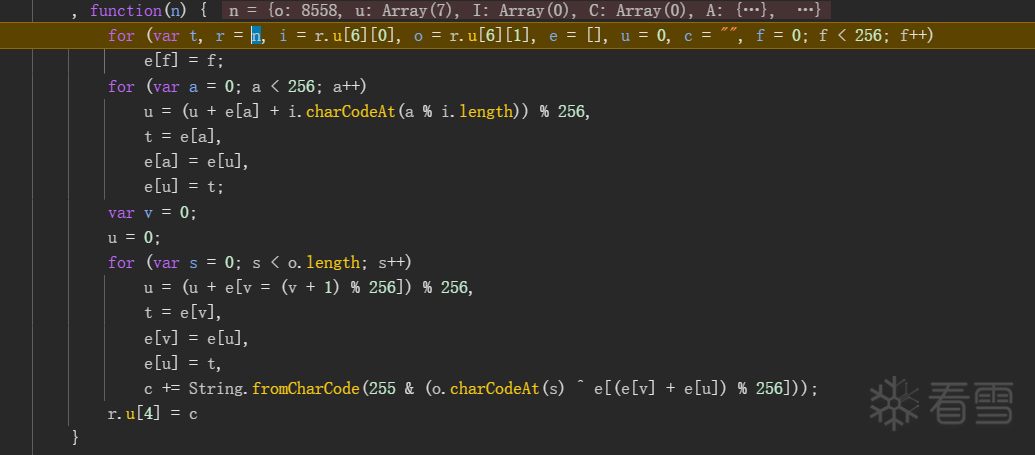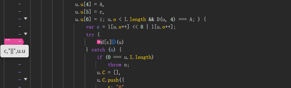 经过尝试,发现一直在循环执行d[c](u)方法,c是指令,u为寄存器,很明显的jsvmp。