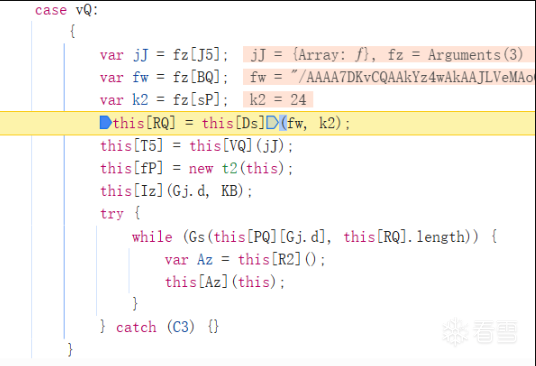 跟进w函数中,this[Ds]就是字符串生成数组的位置了,直接还原算法就ok了,这个字符串是和js文件绑定的,后续会和动态ver、动态常量一起出一篇简单分析。