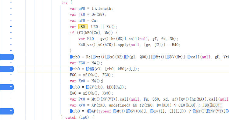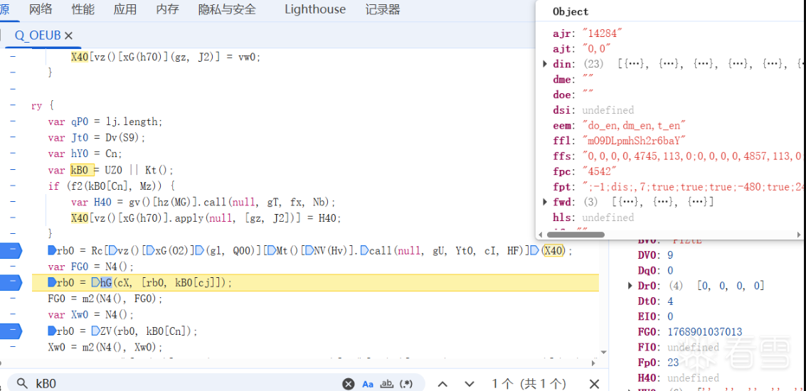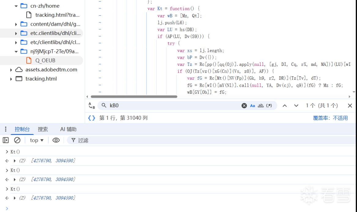 直接搜索kB0,可以看到kB0来自前面的Kt(),跟进函数简单还原下。里面有一个cookie['bm_sz'],在get请求Q_OEUB中获取即可。里面还有一个绑定js文件的参数,几分钟变一下,短时间内可以固定。