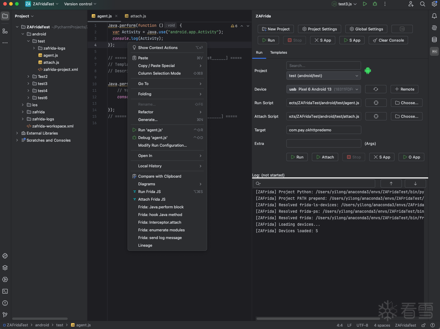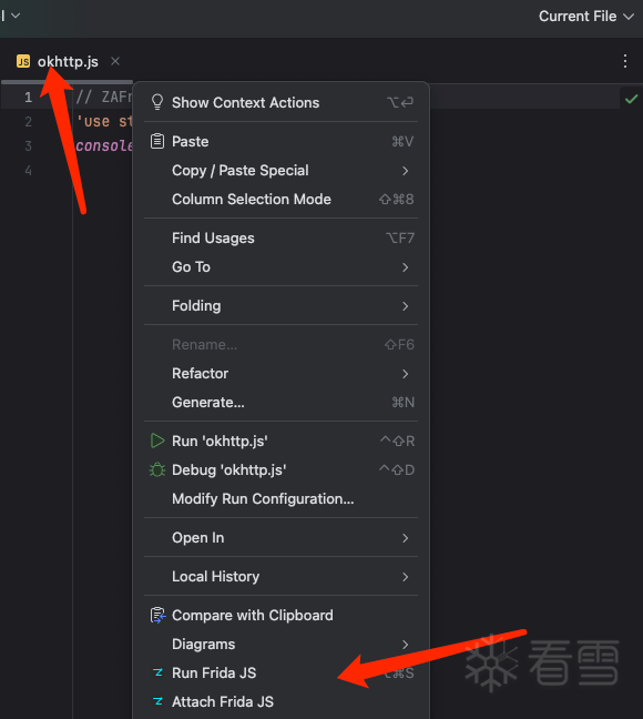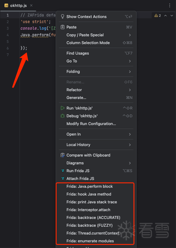 右键 → ZAFrida Frida Snippets: