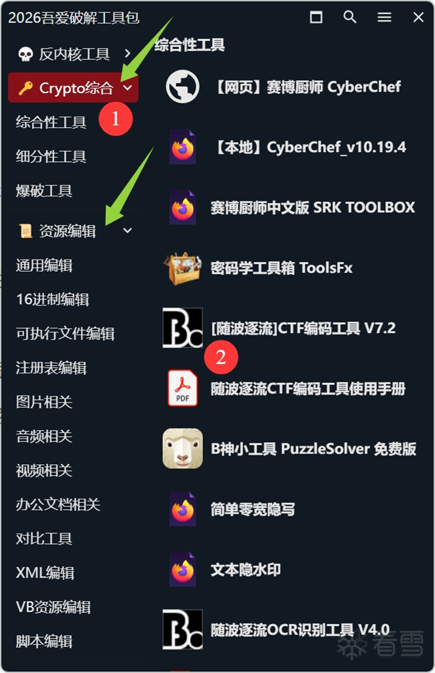5. 【Crypto综合】塞进了很多杂项专用的工具。比如CTF常用的随波逐流一把梭7.2,赛博厨师CyberChef(网页版、本地版、中文本地版都给你塞进来了,怕你不会用!)。