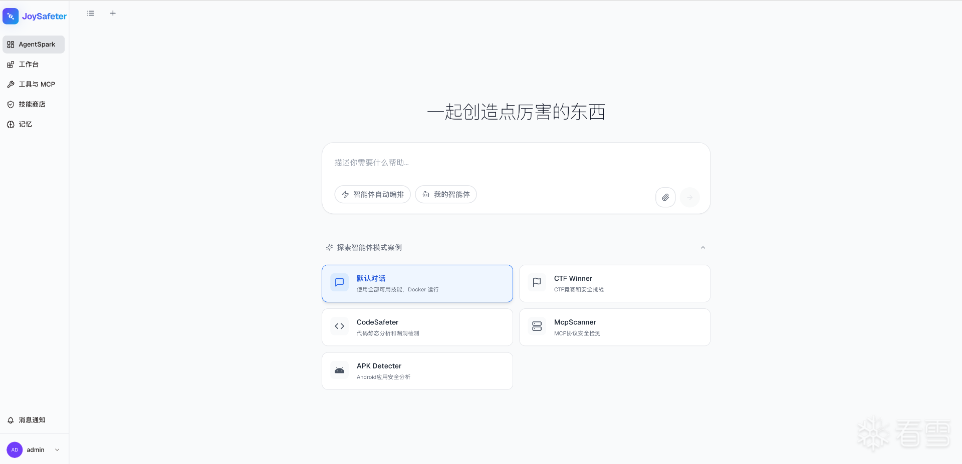 JoySafeter 是一个安全能力的“操作系统”,它不是单一的工具,而是一个能够将无序的安全工具、分散的专家经验,统一编排成协同作战的AI军团的可视化平台。简单来说,它让安全专家能够用“搭积木”的方式,使用自然语言或可视化界面,构建、管理和进化能自主完成复杂安全任务的AI智能体(Agent)。