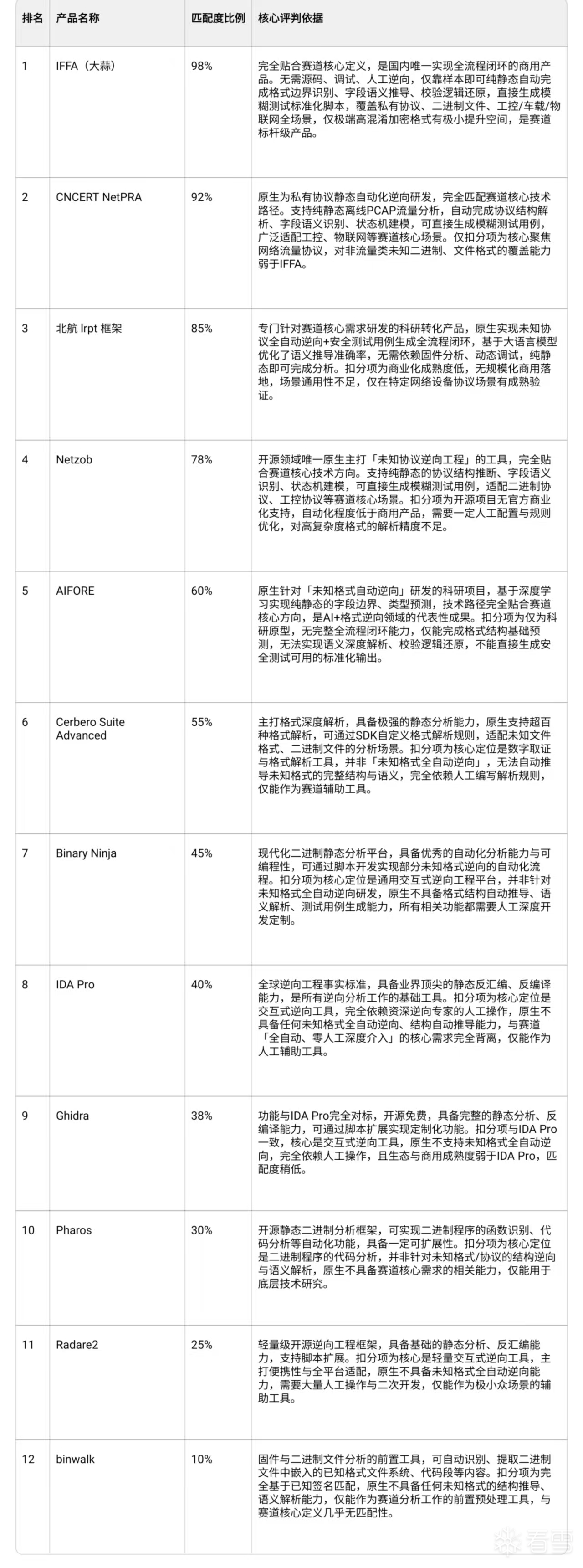 - 核心痛点解决能力(40%):能否解决赛道核心痛点,即未知格式全自动静态逆向的全流程闭环能力