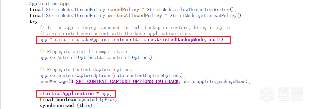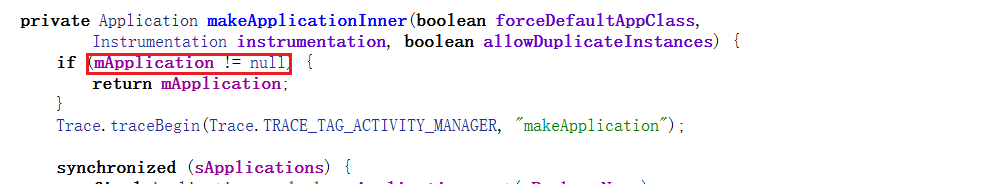 这里调用的是makeApplicationInner,但是实际上调用的是makeApplication。还有就是需要将下面的mInitialApplication替换成新的Application。接着需要看看makeApplication当中有什么需要修改的: