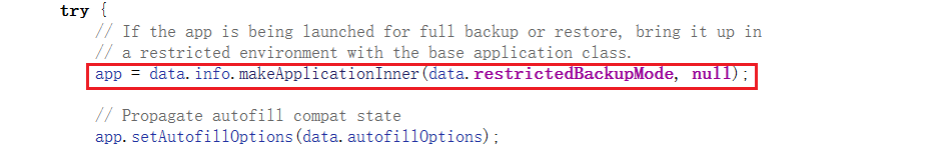 在之前的源码分析中,我们知道了在handleBindApplication当中会创建一个LoadedApk,接着会使用makeApplicationInner来获取一个Application:
