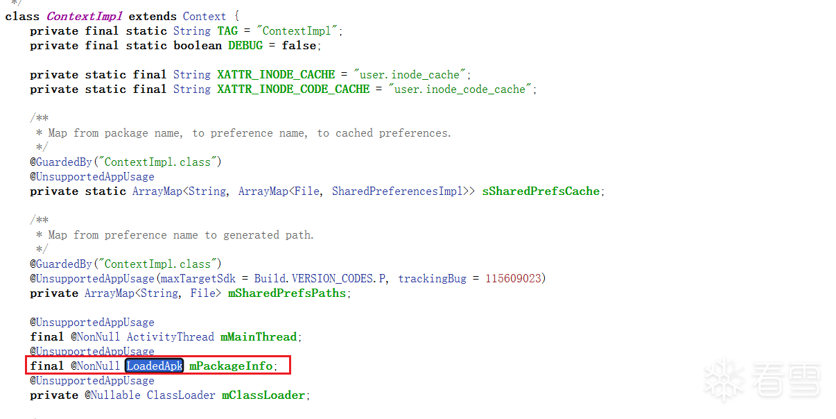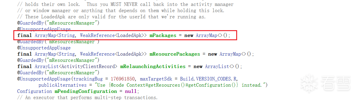 在ActivityThread的源码当中可以看到,ActivityThread有一个mPackages的成员,是一个map,键是包名(String),值是LoadedApk,这意味着我们可以通过获取这个mPackages来获取LoadedApk。这里获取方法也是反射。