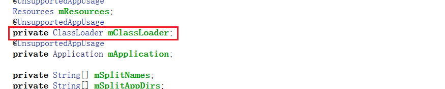 由于app启动时执行的是壳代码的dex的类加载器,想要应用正常执行,就需要将类加载器也就是mClassLoader换成源程序的dex的加载器才能正常执行。可以通过源码查看一下mClassLoader在LoadedApk当中的属性:
