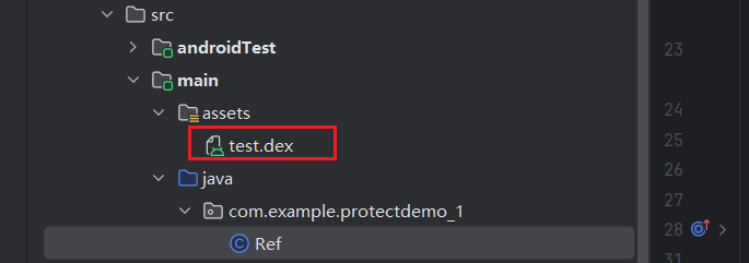这里使用ActivityThread的方法来获取LoadedApk,并且从文件中加载dex,使用反射替换mClassLoader。来实现环境的修复,首先需要在main文件夹下创建一个assests的文件夹,然后将被保护的dex文件放入文件夹当中(这里实验使用落地加固),如下: