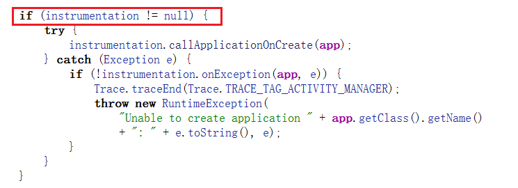 我们需要这两个条件当中的代码不执行,所以需要传入的forceDefaultAppClass = false,instrumentation = null。综上所述,我们需要在OnCreate当中添加如下代码: