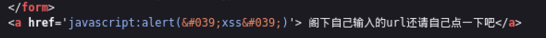 而对于href=javascript:alert(' xss')来说,浏览器在解析html属性时,会先将 html实体还原成字符,所以实际 href 的值变为 alert('xss')