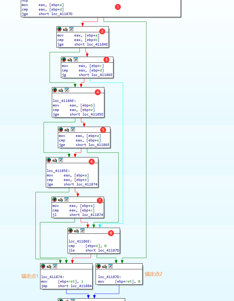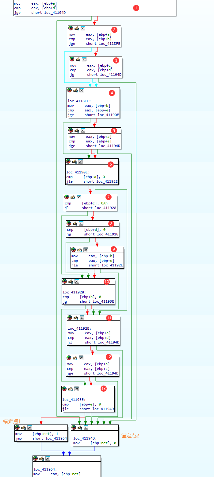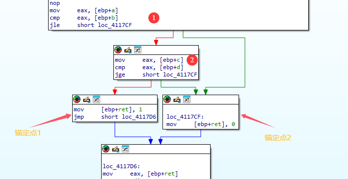 节点①跳转至锚定点2,因此“不跳”表示条件为真,即 a > b;节点②为尾部条件节点,亦不跳,即 c < d;逻辑运算符为 &&,最终还原为:a > b && c < d。
