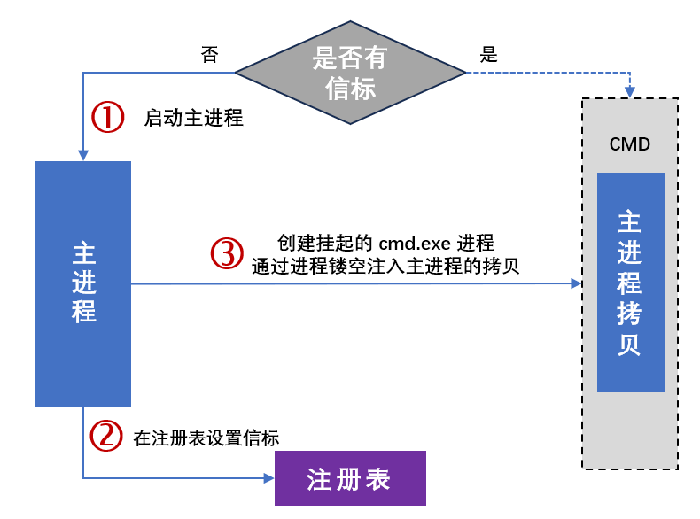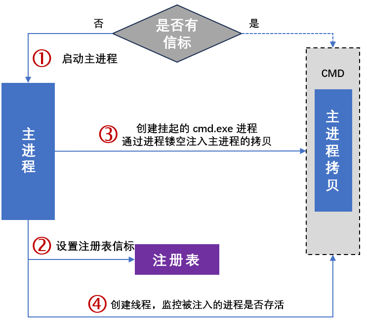 - 恶意程序在首次启动时,判定自身为主进程;它在注册表留下信标,随后将自身代码镂空注入到合法进程(如cmd.exe)中,形成守护进程,并启动子线程反向监控该守护进程;若守护进程被杀,主进程的监控线程会重新创建新的守护进程;