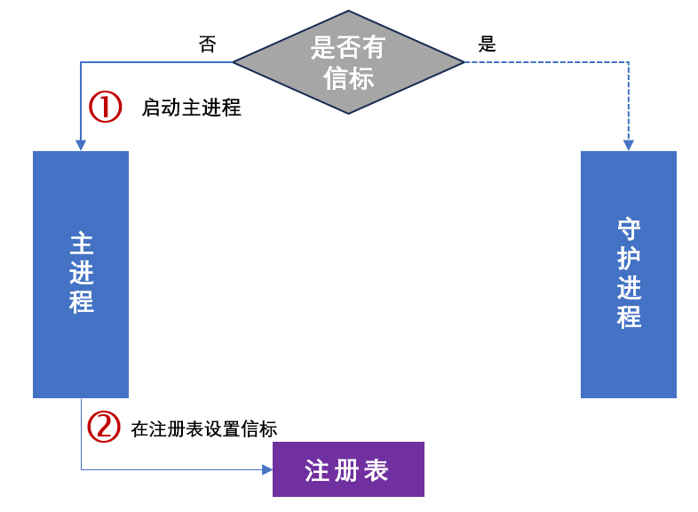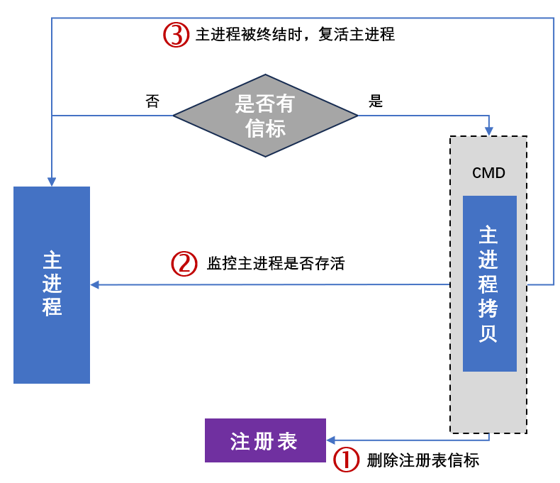- 守护进程运行时会删除信标,获取主进程句柄并阻塞等待;若主进程被杀,守护进程立即复活主进程;