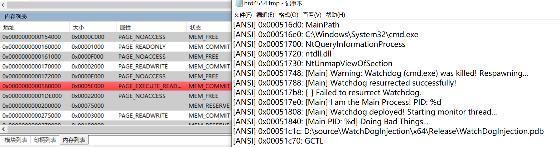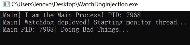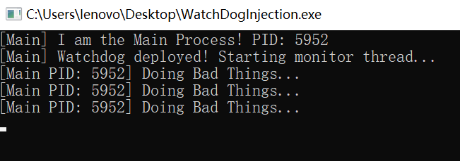 在主进程将自身注入到 cmd.exe 进程中后,守护进程就开始运行了,它什么都不干,就死死盯着主进程的 PID。一旦主进程被杀掉,WaitForSingleObject 瞬间放行,守护进程立刻将本体“复活”。