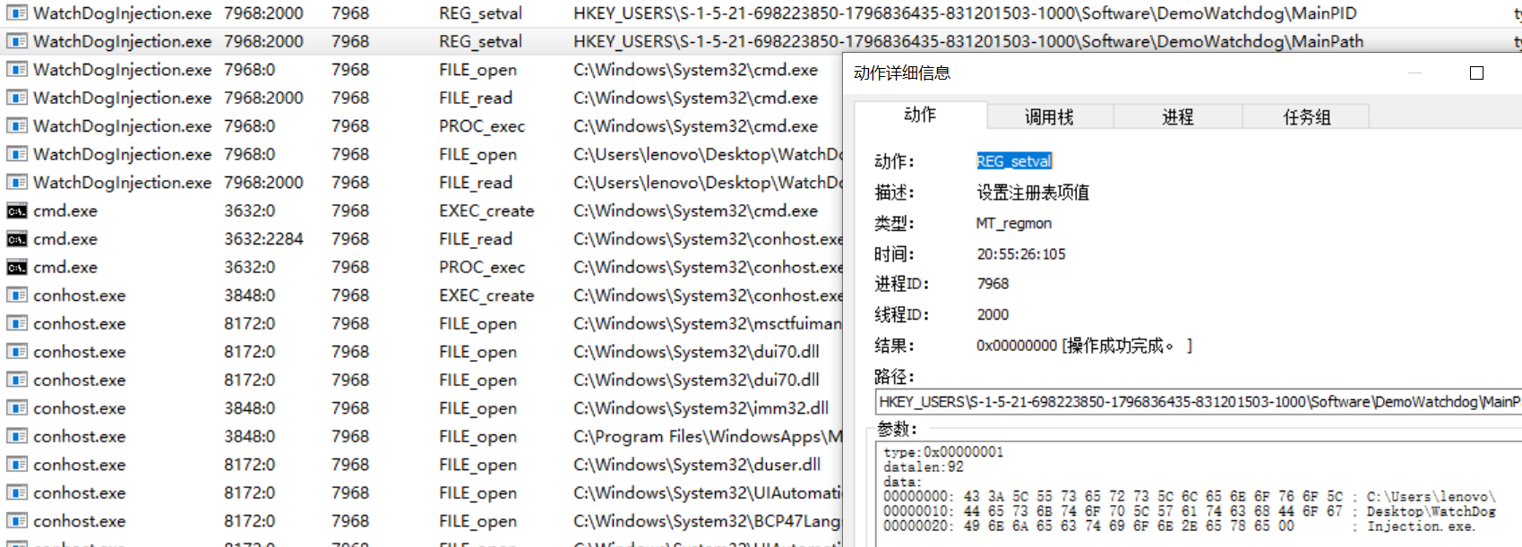 主进程 WatchdogInjection.exe 启动后,将 PID 自身的文件路径写入了注册表 Software\DemoWatchdog\MainPath