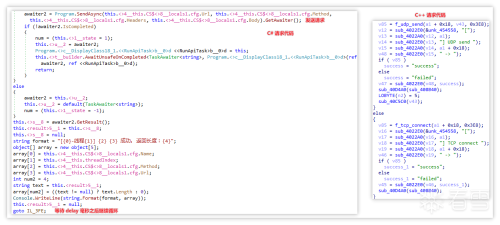 从上述游戏盒子中的逻辑可以看出DDos病毒会有两种,两种病毒分别为C#与C++所写,但其中逻辑基本一致,可以通过云控配置的解密和解析手段判断,其中云控配置依然是通过HTTP下载,且云控配置同样是被DES加密并使用Base64编码的字符串,同时云控配置的结构同样是类似于INI文件的自定义结构。