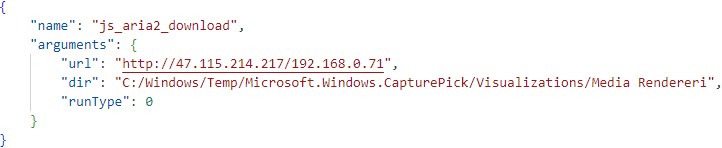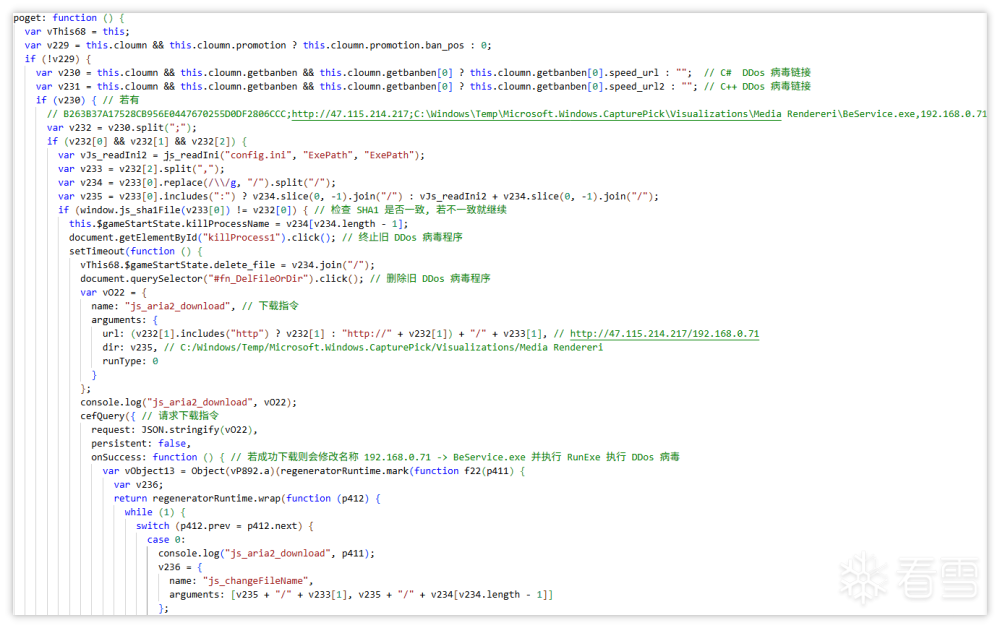 该poget函数会从云控配置中读取speed_url与speed_url2字段,从中解析出病毒SHA1、主域名、文件路径及下载文件名等信息。随后,程序通过cefQuery通信接口向宿主端(steamall.exe)发送js_aria2_download、js_changeFileName、RunExe等命令,依次完成 DDoS病毒的下载、重命名及执行操作。