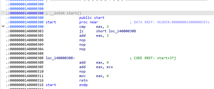 本文以一个最小exe文件来分析反编译器的流程,IDA载入该exe文件,可以看到在0x140000300的程序开头处是一条比较语句,Ghidra如何处理这条指令呢?