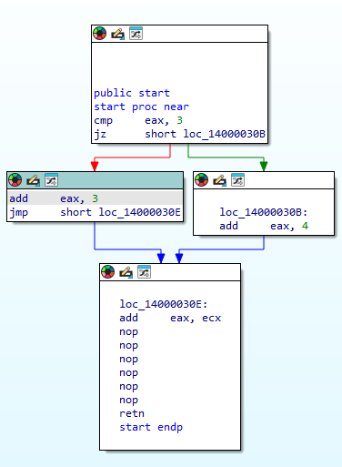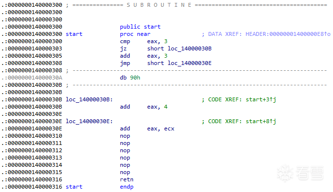 首先是判断语句cmp,比较eax和3,如果eax为3,则z标志位为1,jz跳转实现,将eax+4赋值给eax,执行14000030E代码,如果eax不为3,z标志位不为1,将eax+3赋值给eax,然后跳转执行14000030E代码。