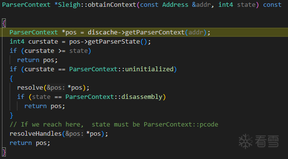 simm8_32: simm8 is simm8 { export *[const]:4 simm8; }这样“cmp eax,3”这条指令就被转换为了内存中的数状结构以便接下来的程序继续处理。- 反汇编结构就分析到这,接下来是resolveHandles()函数,这个函数中会继续分析“cmp eax,3”汇编语句机器码83 F8 03的后两个字节,对汇编比较熟悉的朋友知道F8字节用于确定cmp指令的第一个操作数是哪个寄存器,在ia.sinc的3062行首先可以看到