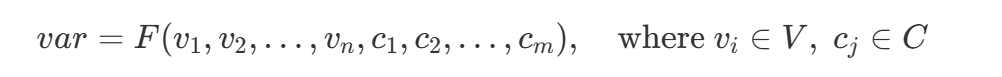 其中 VV 是所有参与构造 var 的变量集合,CC 是所有参与构造的常量集合。函数 FF 是对构造 var 的数据流的一般性表示。以上面的例子为例,FF 可以表示为`GV-MaskValue`.