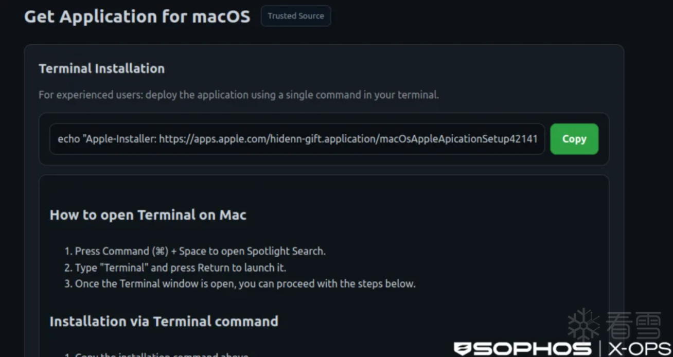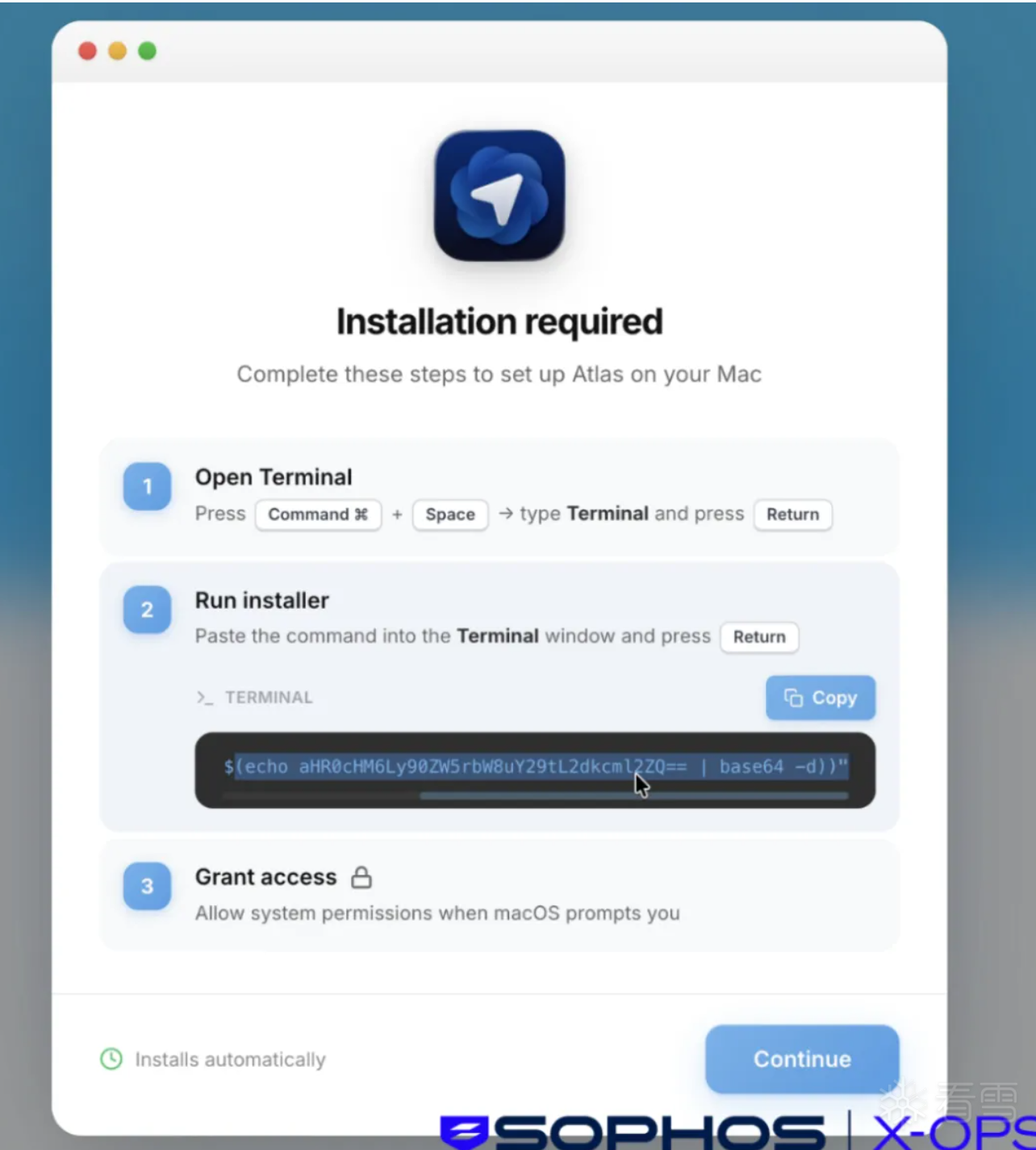 ClickFix是一种利用用户信任的攻击手法,通常通过虚假网站或页面,引导用户复制并运行看似无害的终端命令。这些命令一旦执行,就会下载并安装恶意软件,例如最近活跃的MacSync信息窃取器。由于命令由用户手动执行,这类攻击能有效绕过Gatekeeper、XProtect等macOS内置安全机制。