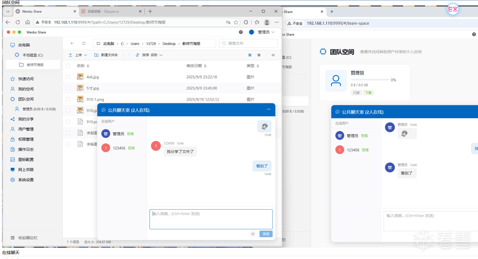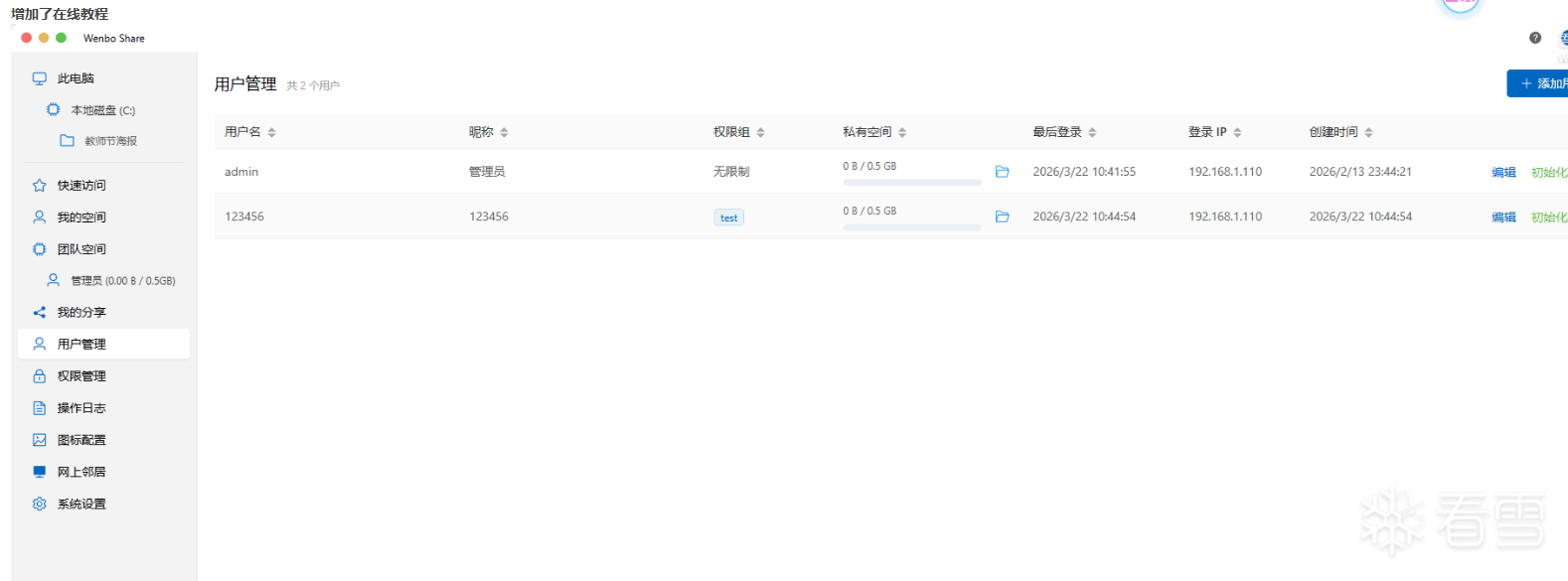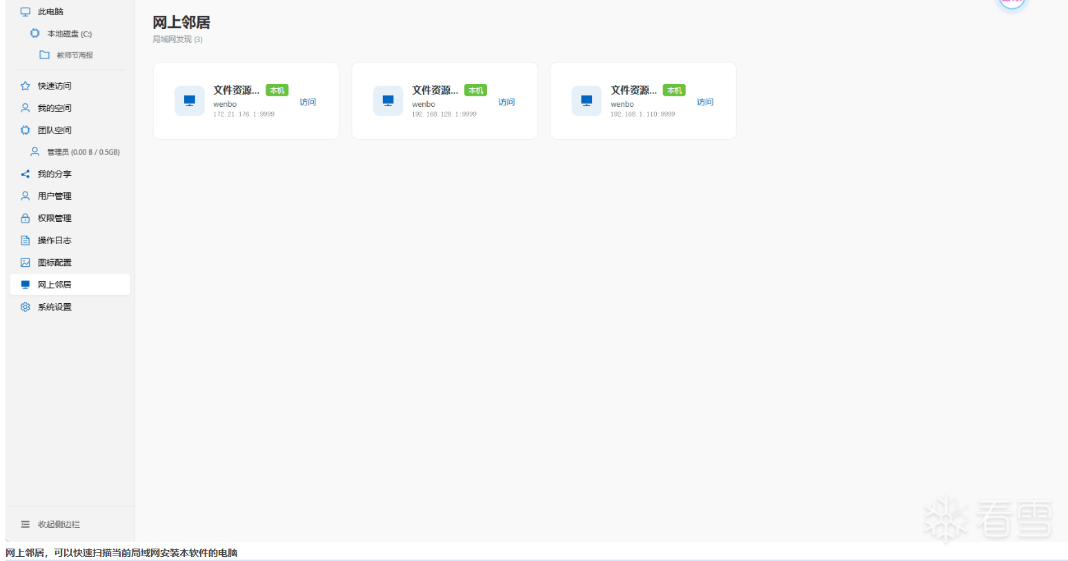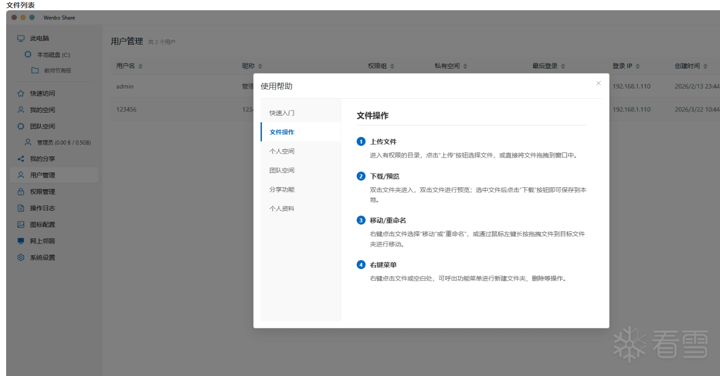 20260322 V1.7功能概述---------------------1.增加在线聊天,实时刷新文件(当有用户变更文件或者增加文件会自动刷新当前文件夹,无需手动也能快速看到文件实时情况);2.增加网上邻居,快速扫描局域网所有的电脑(需要运行本软件);3.增加在线教程,增加用户管理快速打开私有文件夹;其他优化功能;4.修复已知功能,例如删除用户后无法注册/添加;重启切换网卡没记录的问题等;5.更多功能自行体验,软件现在大体功能已经具备,后续升级根据叠楼的建议来进行升级注:假如开启了登陆模式需要验证初始管理员密码账号:admin 密码:admin123私有空间如需在团队空间显示得自行在个人空间右下角对自己的私有空间进行共享链接:c61K9s2c8@1M7s2y4Q4x3@1q4Q4x3V1k6Q4x3V1k6H3j5h3&6Q4x3X3g2T1j5h3W2V1N6g2)9J5k6h3y4G2L8g2)9J5c8Y4y4Q4x3V1j5I4d9s2S2d9f1X3&6r3j5e0V1H3y4q4y4z5y4o6y4r3y4h3u0Q4y4h3k6T1i4K6u0V1f1r3N6Q4x3@1k6H3N6$3c8Q4x3@1c8&6P5Y4k6E0链接:e04K9s2c8@1M7s2y4Q4x3@1q4Q4x3V1k6Q4x3V1k6H3j5h3&6Q4x3X3g2I4N6h3q4J5K9#2)9J5k6h3y4F1i4K6u0r3M7#2)9J5c8X3p5J5z5h3g2T1x3X3g2V1x3$3k6S2y4b7`.`.