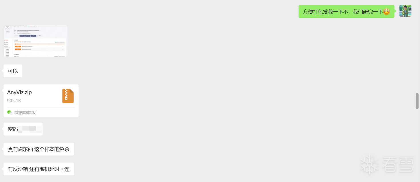 与粉丝师傅关于捕获高隐蔽性免杀样本的沟通记录,双方确认了授权分析与成果共享意向