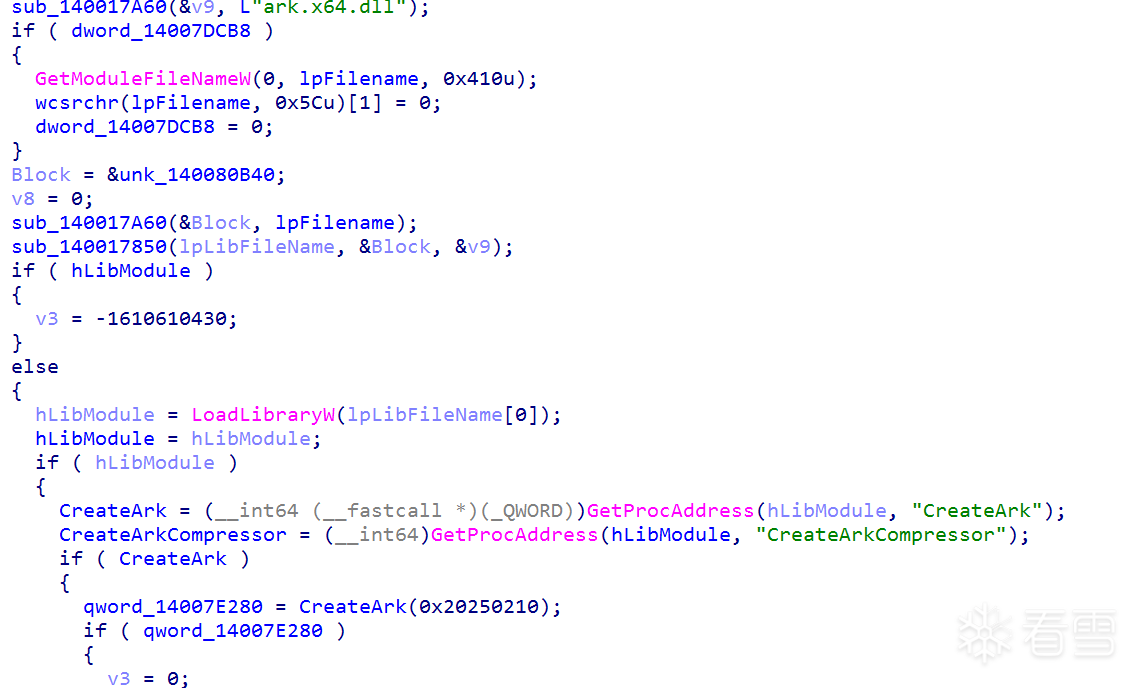 白程序在加载 DLL 后,会主动调用其导出函数 CreateArk,并传入了一个特定的十六进制参数 0x20250210。