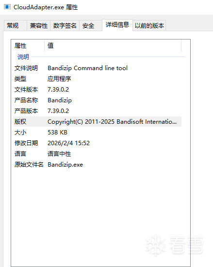 CloudAdapter.exe 的详细信息,显示其原始文件名为 Bandizip.exe