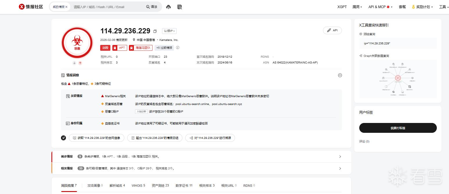 公开威胁情报证实,提取出的核心 C2 节点属于海莲花组织的恶意基础设施