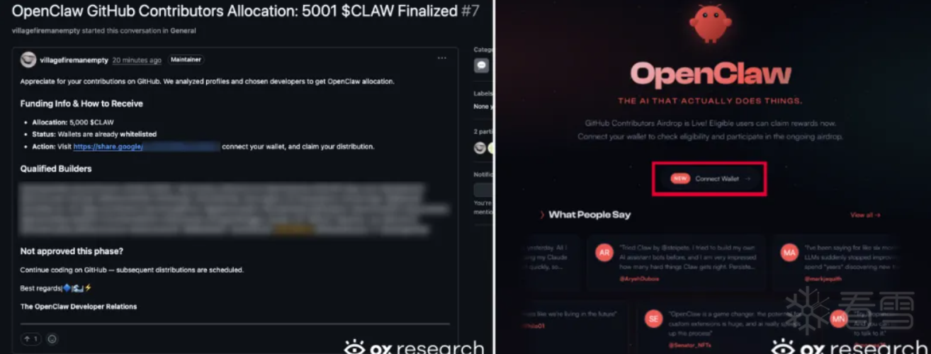 这样做的结果就是,这些开发者会通过邮件或GitHub APP收到一条看似来自官方项目的通知。当他们点进去,看到的是一则“喜讯”:为了感谢你对OpenClaw项目的贡献,你已被选中,将获得价值5000美元的$CLAW代币奖励。