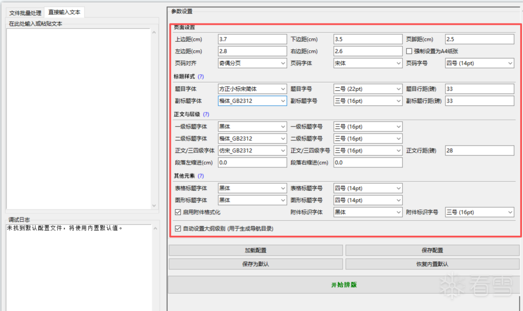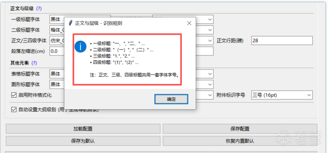 5.再说下标题这里,自动识别一、(一)、1.、(1)四级常规标题。还有一个杀手锏是,即便是二级标题和正文在同一段落也能分别排版,不拆段落,这在同类工具里非常少见。