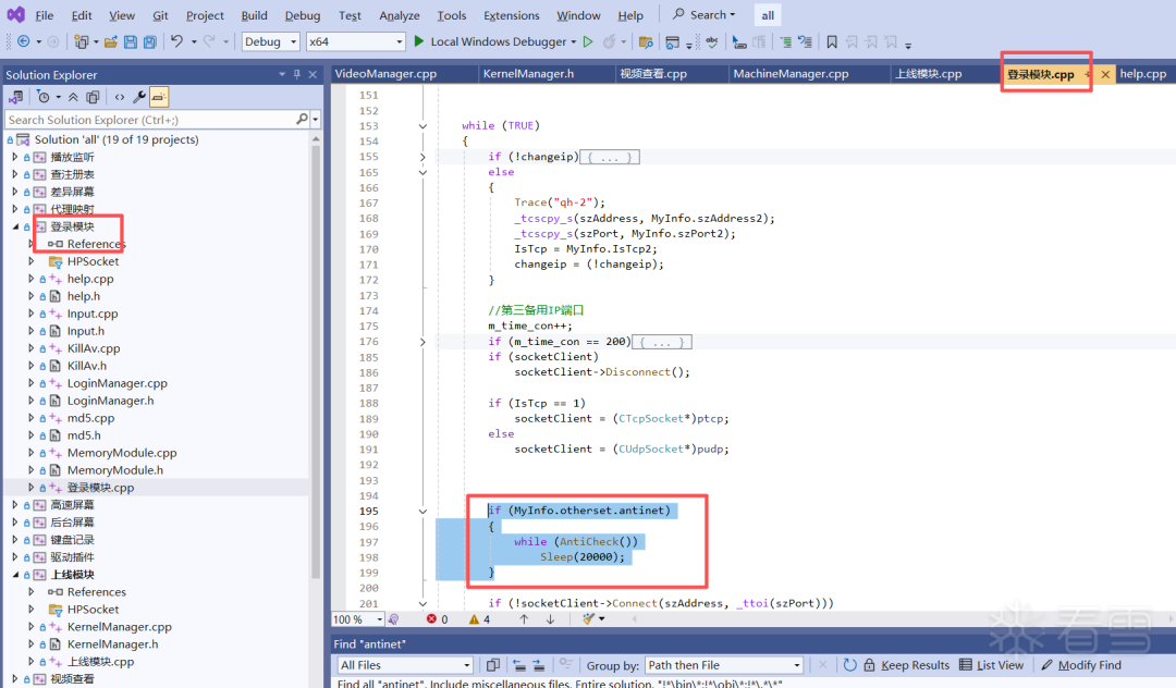 对应的配置项名叫antinet,反流量侦查有多处,这里以登录模块建立网络连接之后立马检测为例,如下图所示: