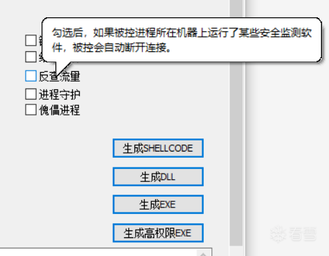 在银狐生成被控端的界面,有5个可选项,分别是: