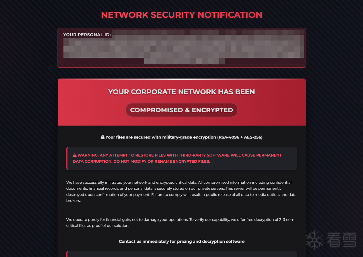 该组织的核心运营模式为双重勒索。在部署加密程序前,攻击者会投入大量时间在受害者网络中进行侦察,并窃取海量高价值敏感数据。这种策略构成双重威胁:一方面,数据加密导致业务运营中断;另一方面,泄露威胁带来声誉损害、法律诉讼及监管罚款等风险。即使受害者拥有可靠备份可恢复系统,仍面临数据公开的巨大压力,从而大幅提升支付赎金的可能性。