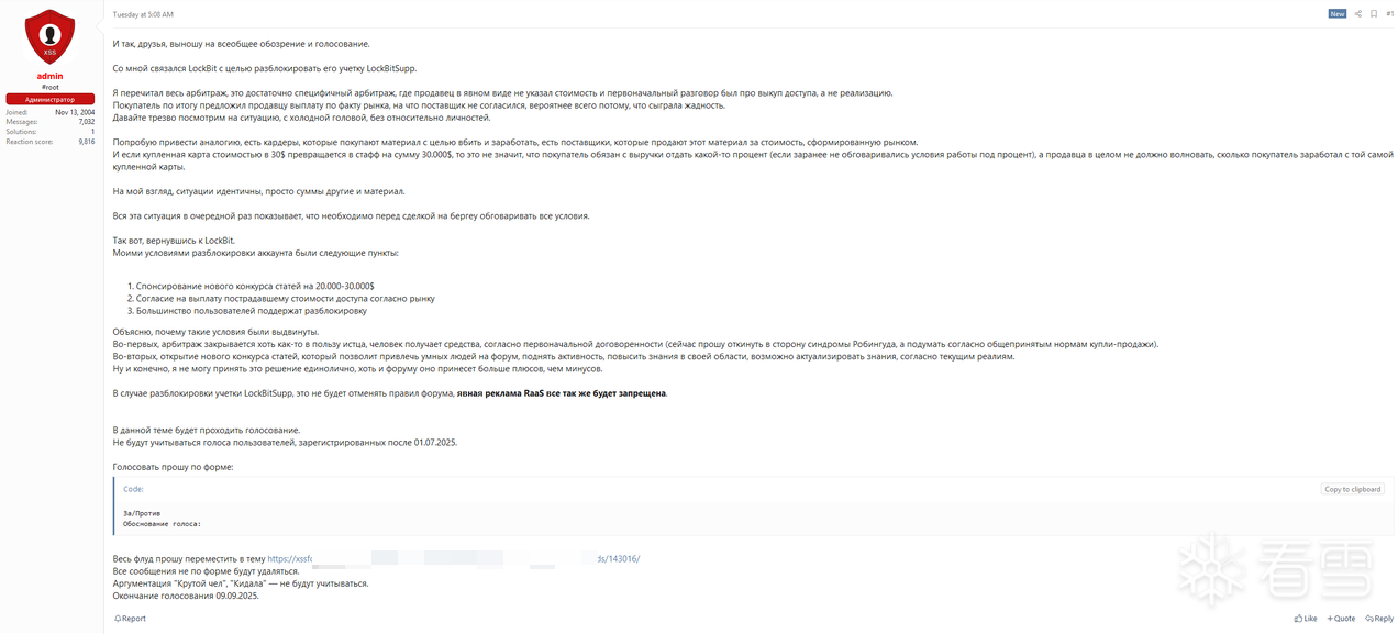 2025年9月Lock Bit 5.0发布,2025年9月初lockbit勒索组织在RAMP论坛宣布在Lock Bit 诞生6周年之际推出Lock Bit 5.0,其lockbit暗网博客显示的加盟费用为500美元标志着(RaaS)加盟模式的便利。(其初期要求加盟组织支付1比特币(BTC),克罗诺斯行动后要求的加盟金额则为777美元。)