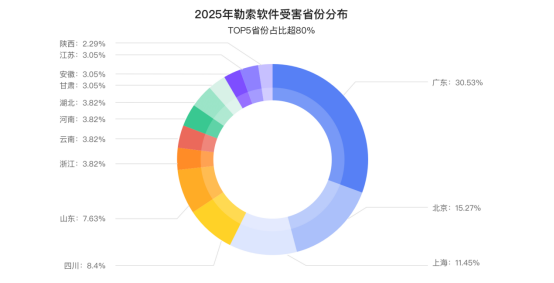 从整体分布来看,广东、北京、上海、四川、山东 等少数省份和直辖市构成了勒索软件受害的主要集中区域。其中,Top 5 省份合计占比接近 80%,其余地区受害占比相对分散,呈现出“头部高度集中、尾部广泛分布”的典型特征。