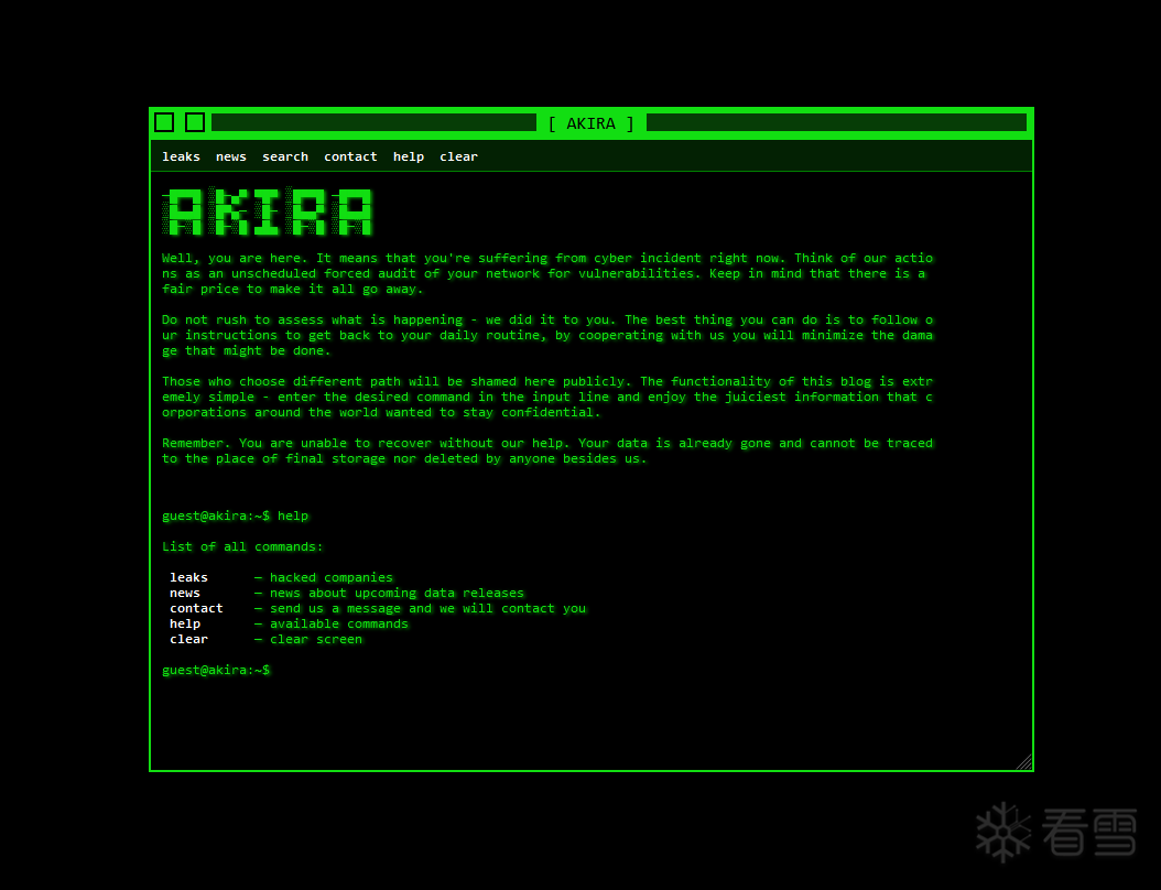 Akira成立于 2023 年 3 月。该组织主要针对美国和加拿大的组织,涉及医疗保健、金融、教育和制造业等行业。