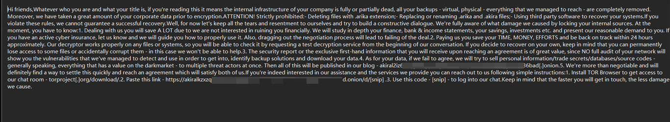 Akira 采用双重勒索软件模型,对受害者的数据进行加密并泄露。该组织要求支付 200,000 美元到 400 万美元不等的赎金,以换取解密文件或不发布敏感数据。Akira 勒索软件的第一个版本是用 C++ 编写的,并附加了带有“.akira”扩展名的文件,创建了一个名为“akira_readme.txt”的赎金票据,部分基于 Conti V2 源代码。
